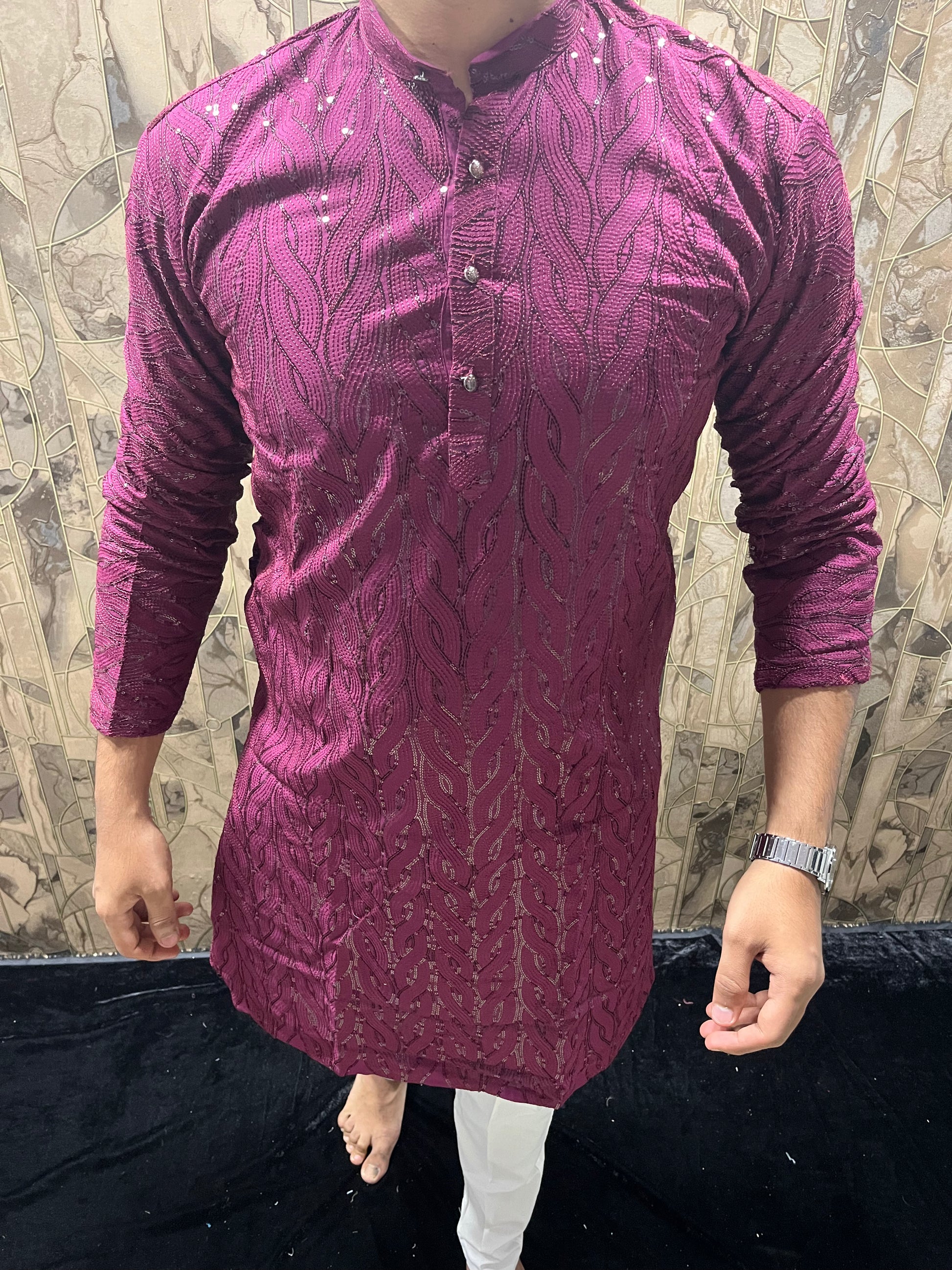 Elegant Cotton Burgundy Kurta with Subtle Sequin Detailing – Festive & Casual Wear - A1