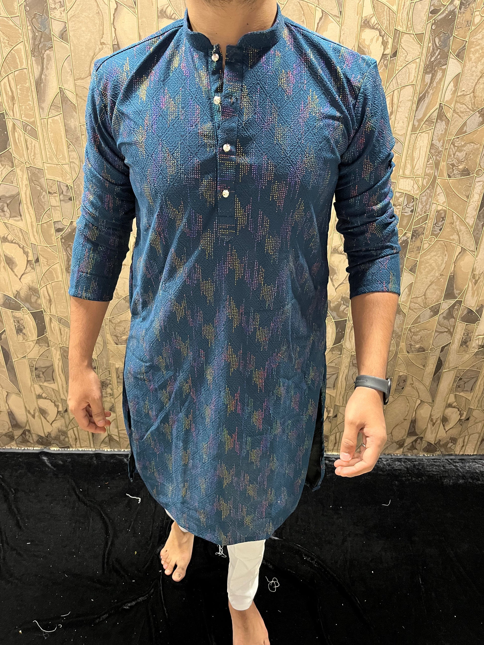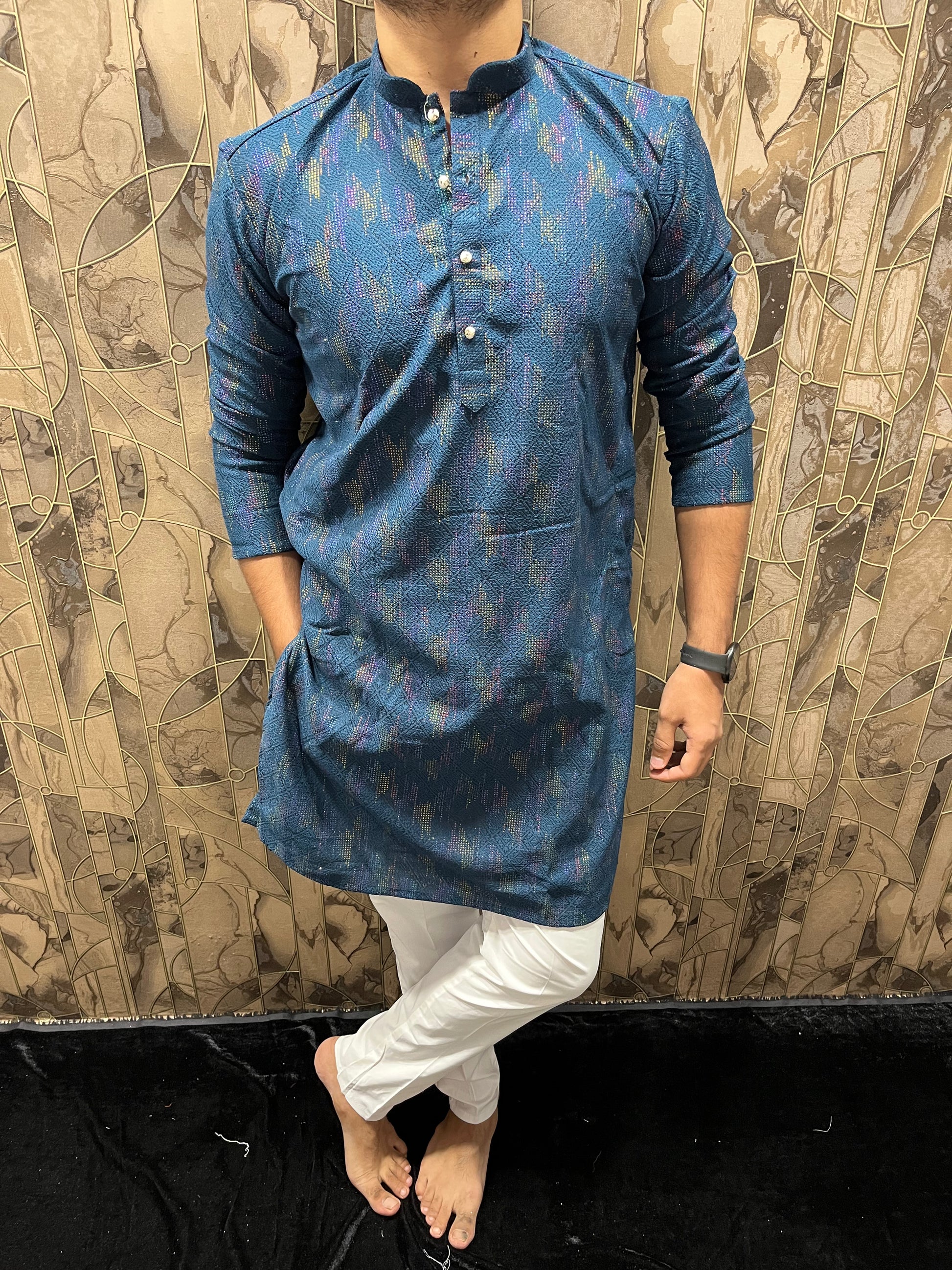 Men’s Blue Kurta – Full Front & Back Embroidery with Gold Detailing for Weddings & Festive Wear A36