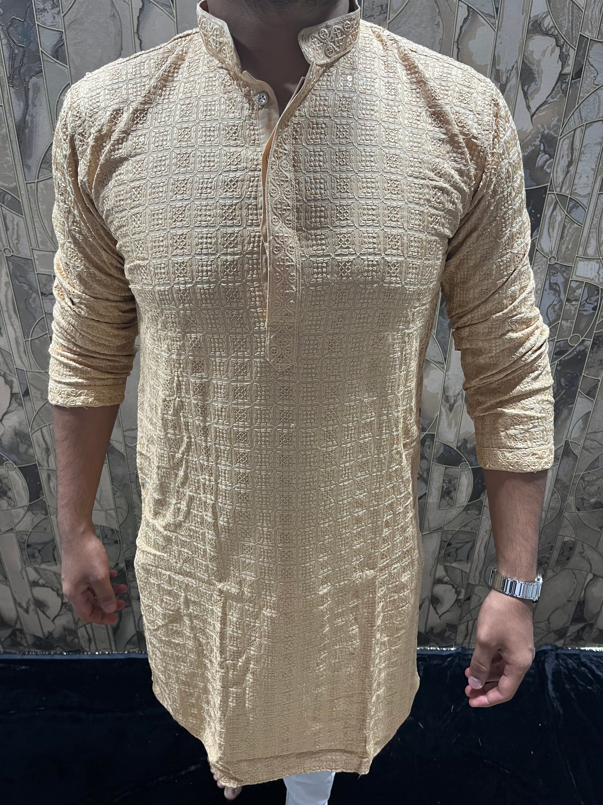 Men’s Chikan Skin Kurta – Elegant Sequence Work for Festive Wear A19