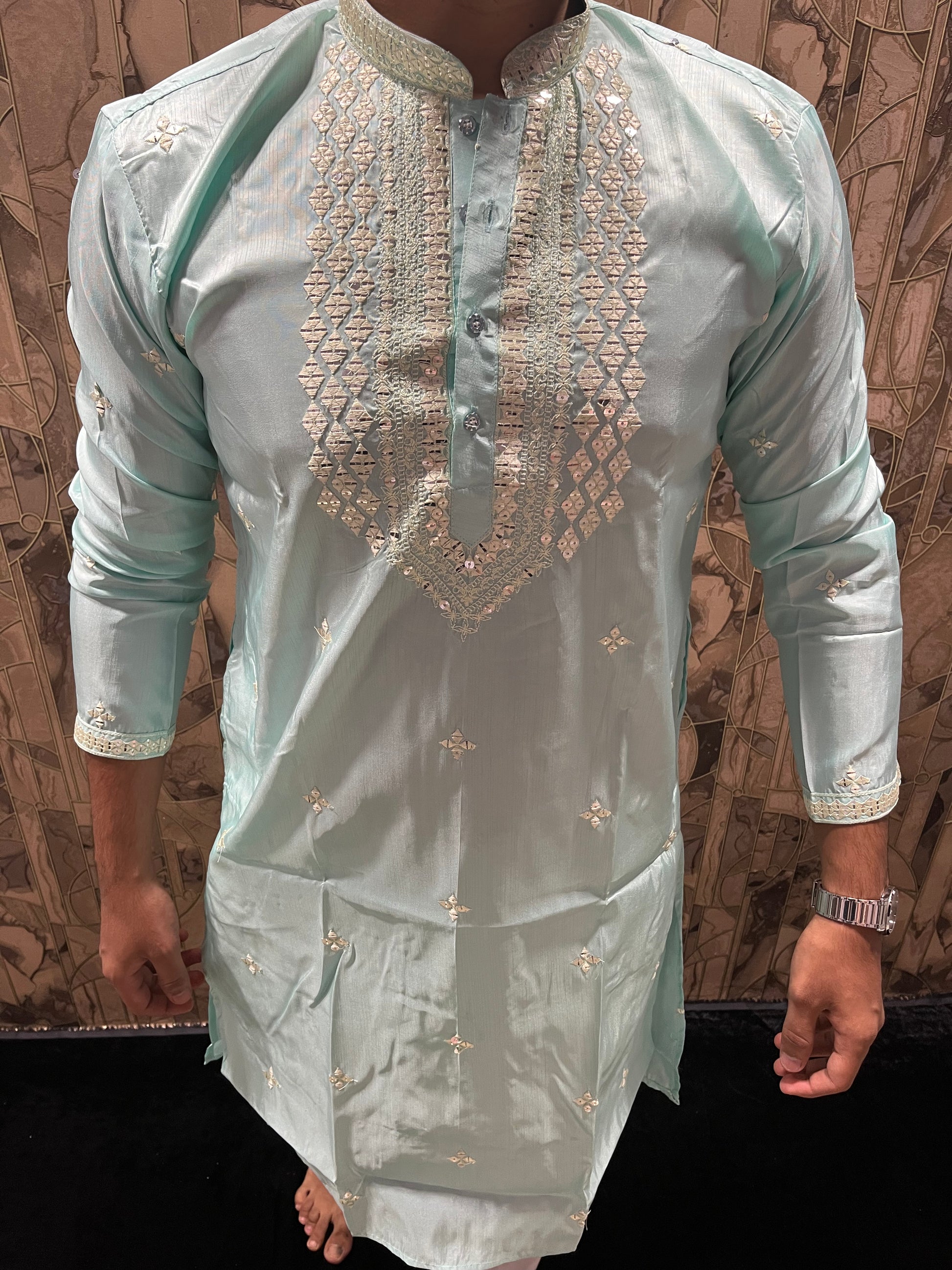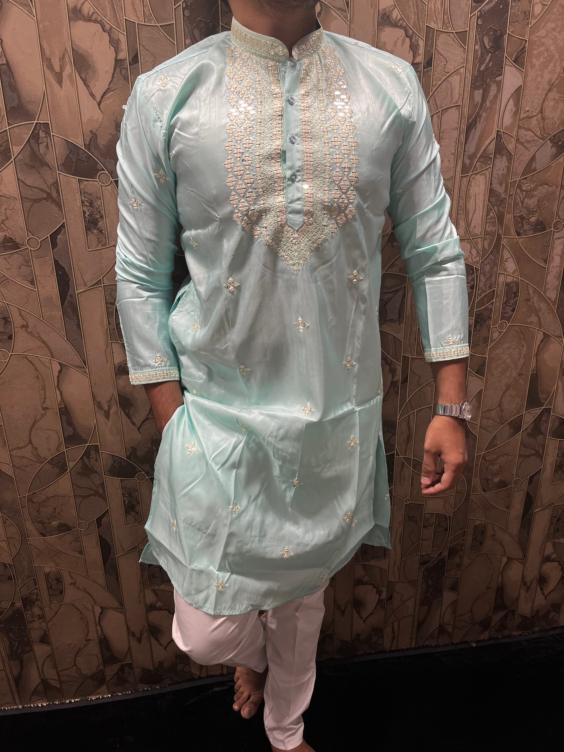 Men’s Cotton Light Blue Kurta – Minimal Neck Embroidery with Sequence Work A25