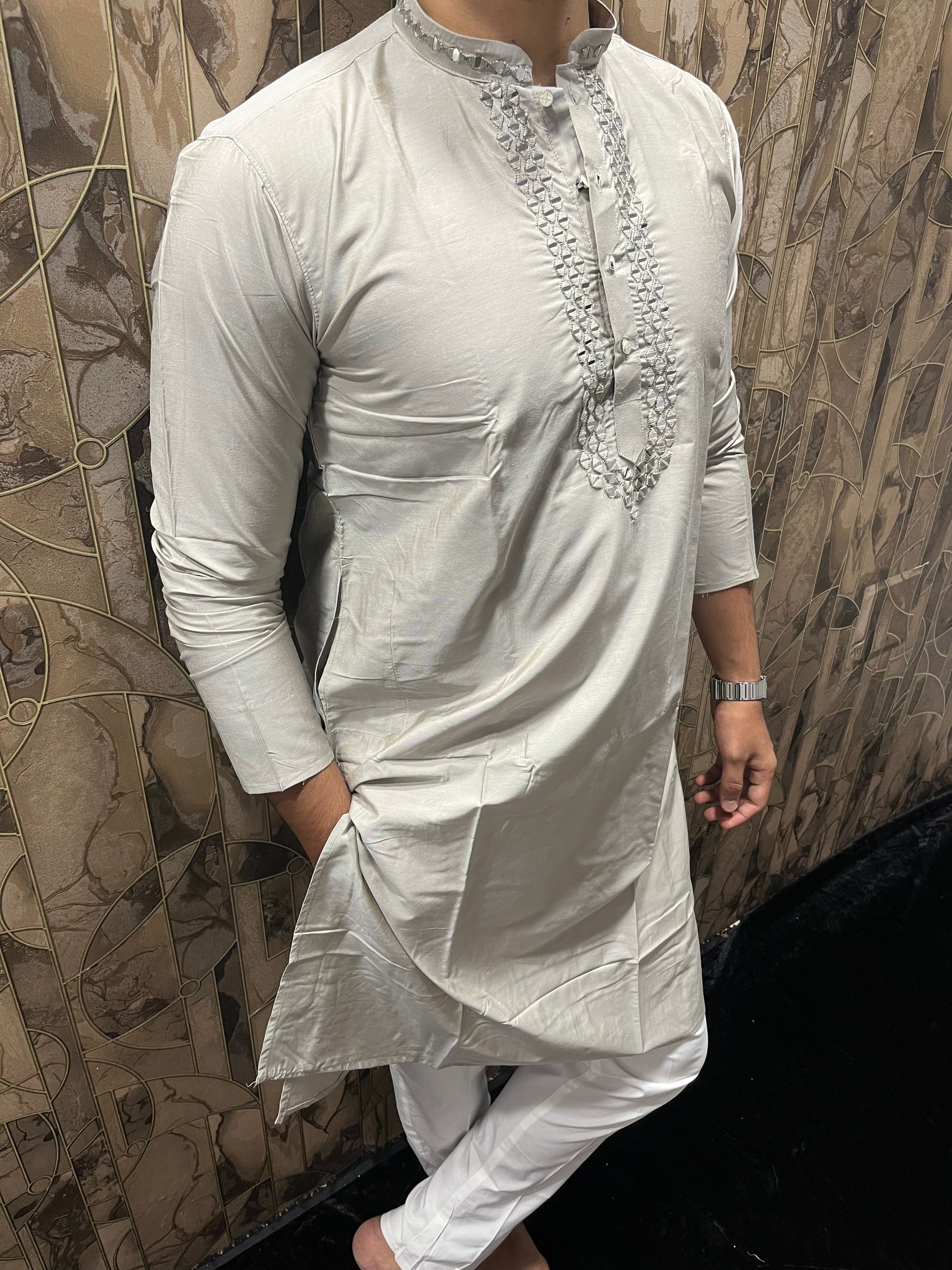 Men’s Cotton Grey Kurta – Classic Plain Design with Mirror Work - A14