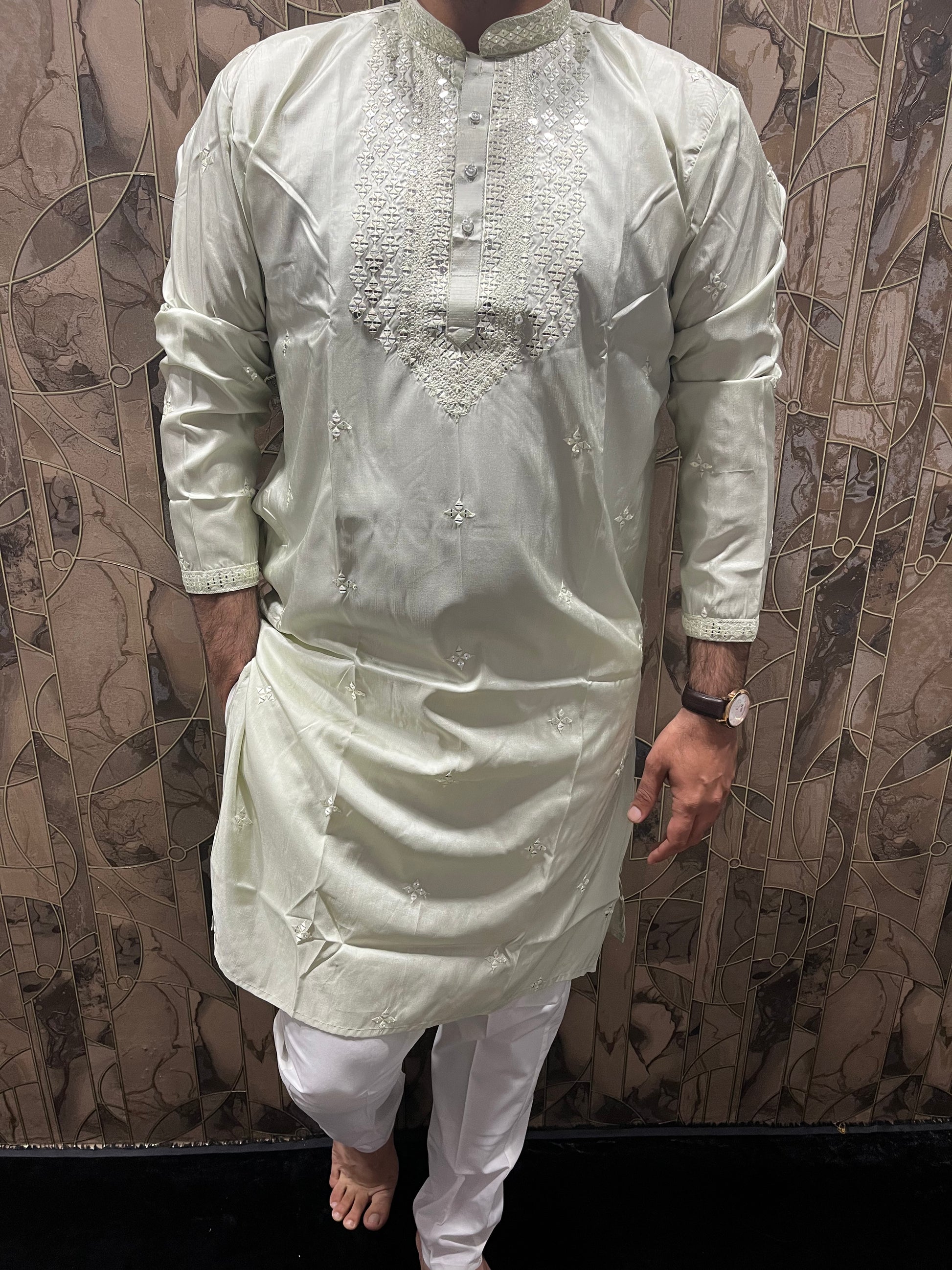Men’s Cotton Light Green Kurta – Minimal Neck Embroidery with Sequence Work A25