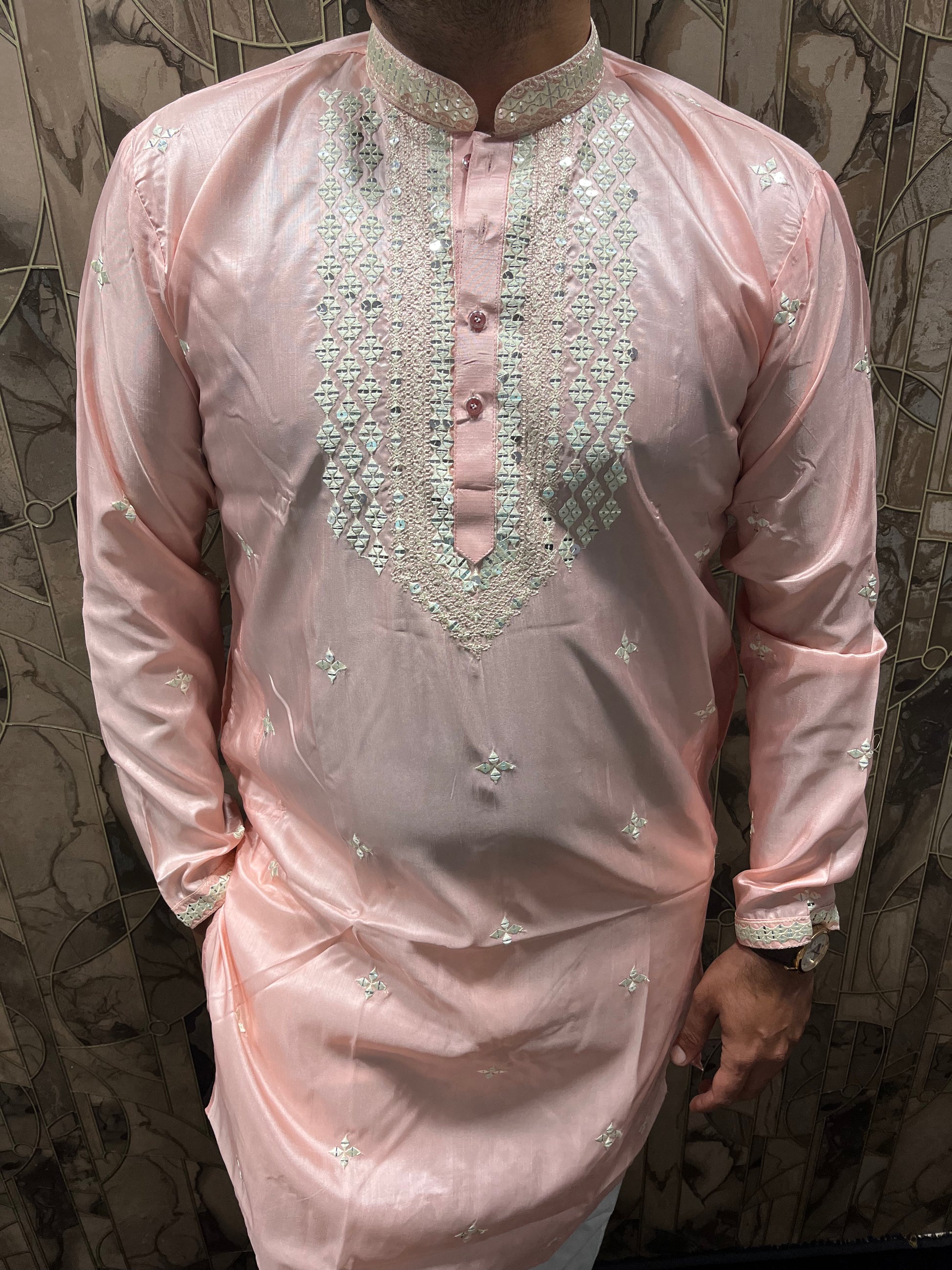 Men’s Cotton Light Pink Kurta – Minimal Neck Embroidery with Sequence Work A25