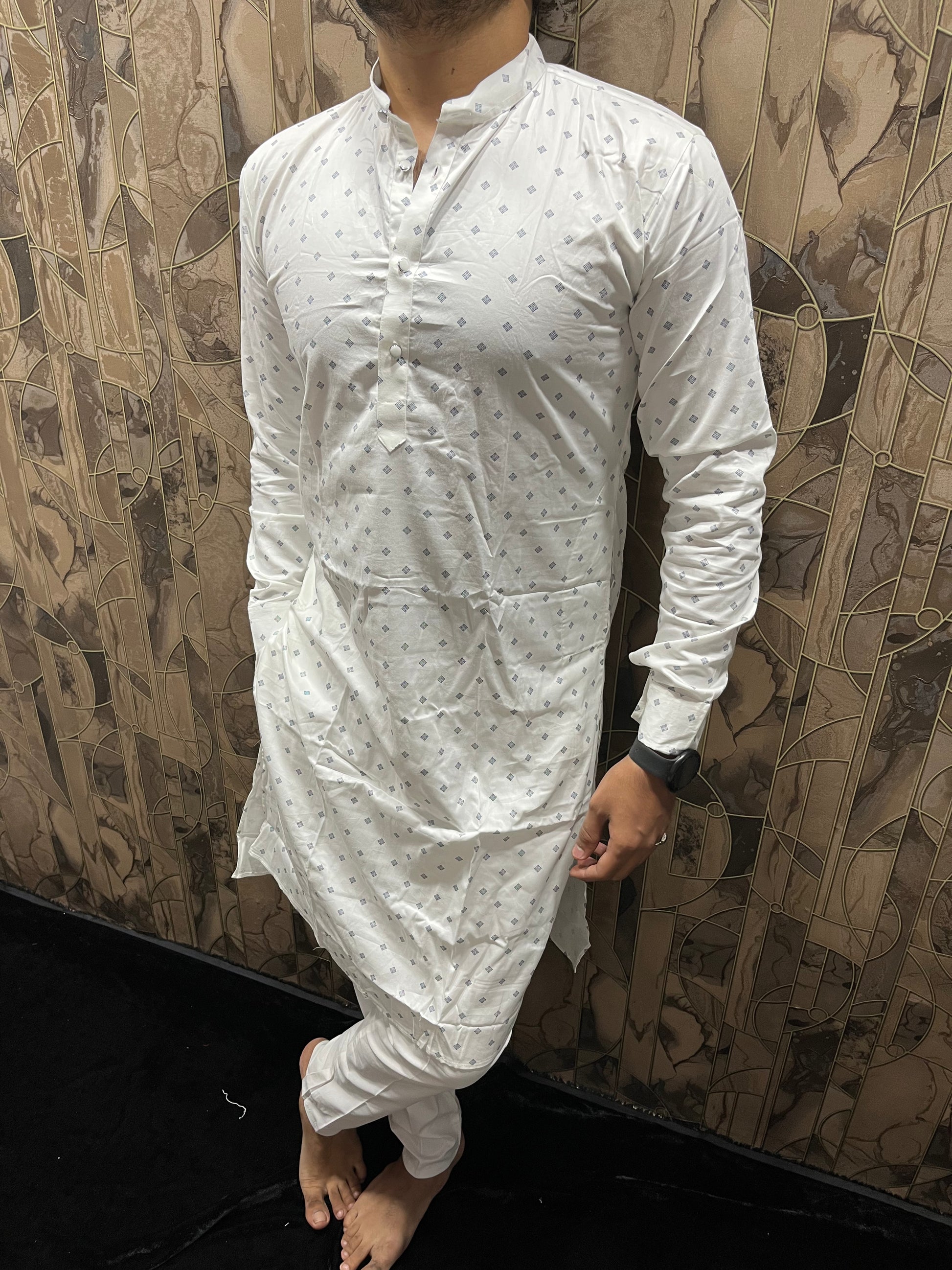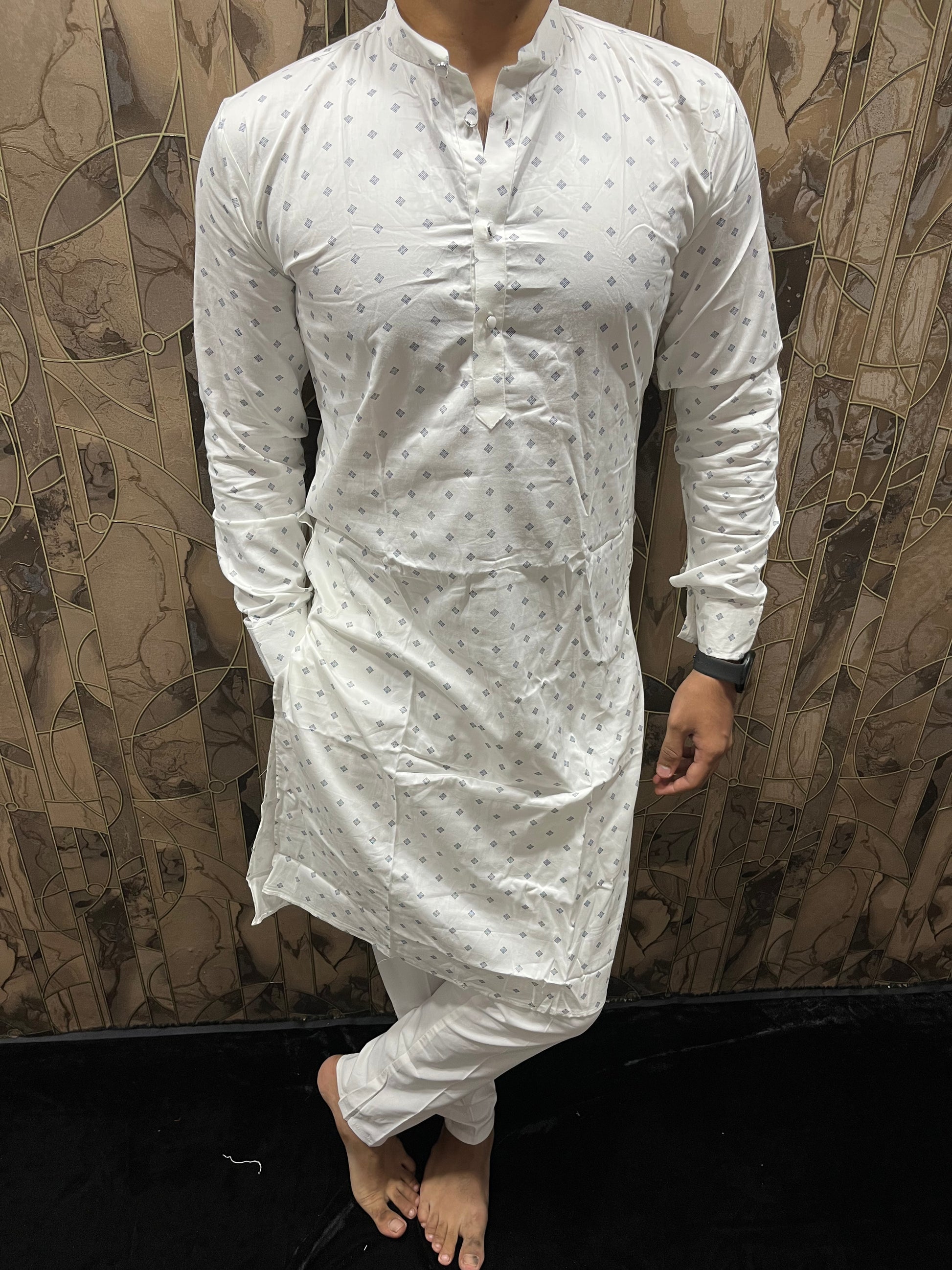 Men’s Cotton White Kurta – Minimal Printed Design for Everyday Wear A33