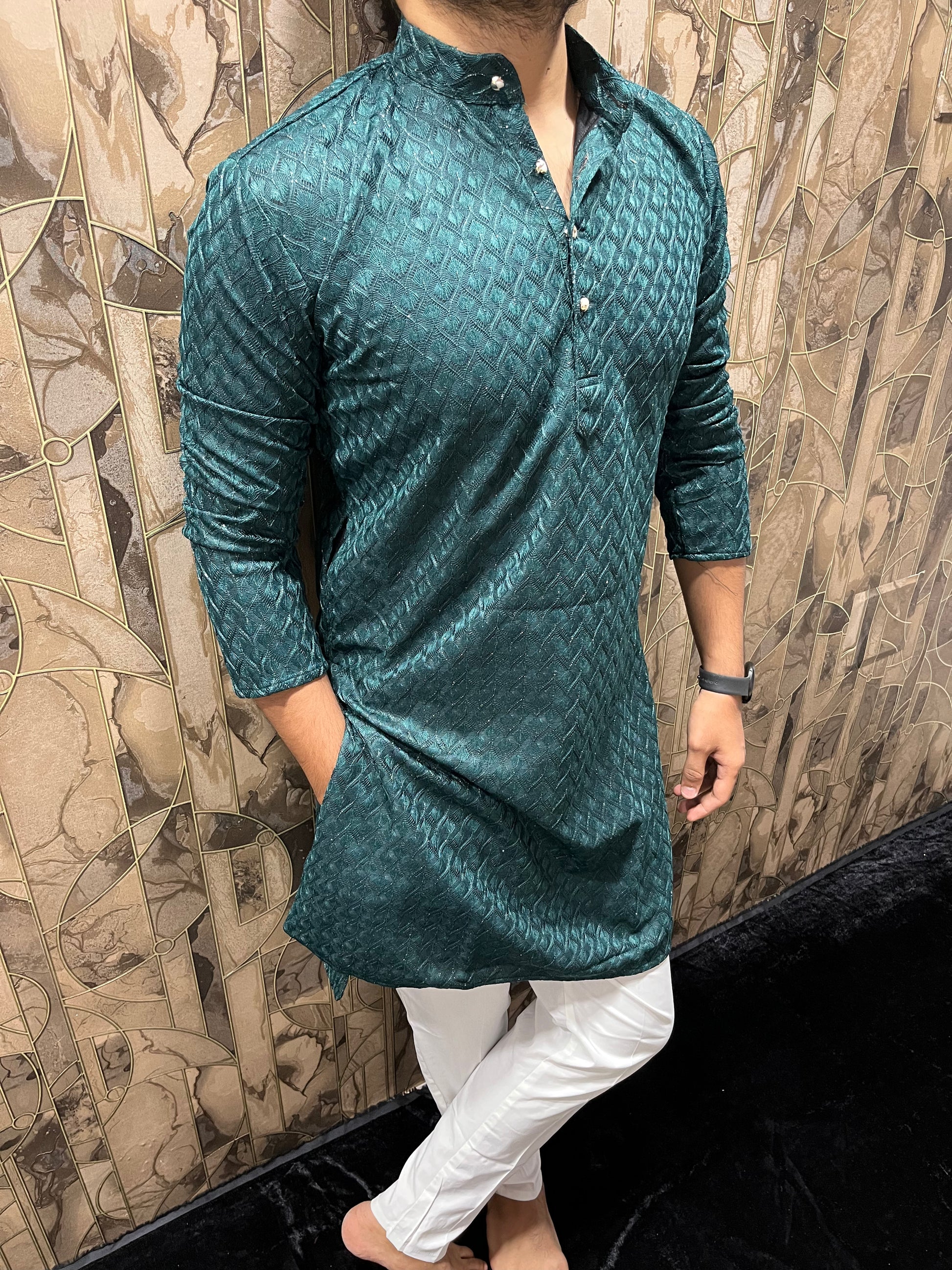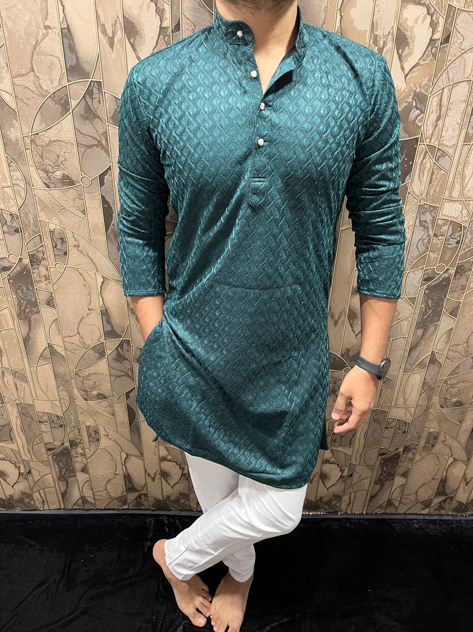 Men’s Green Kurta – Full Front & Back Embroidery with W-Pattern for Wedding & Festive Wear A37
