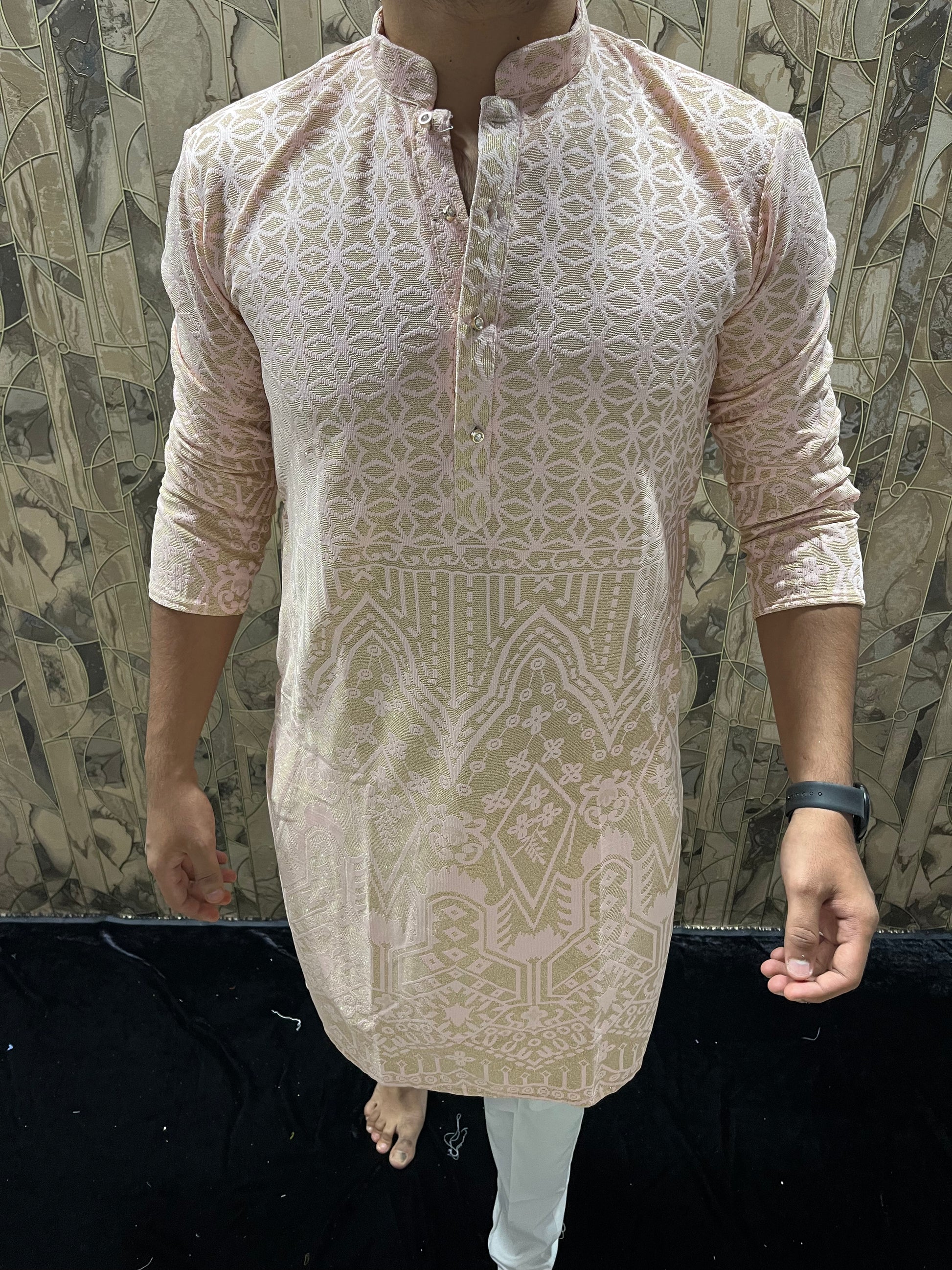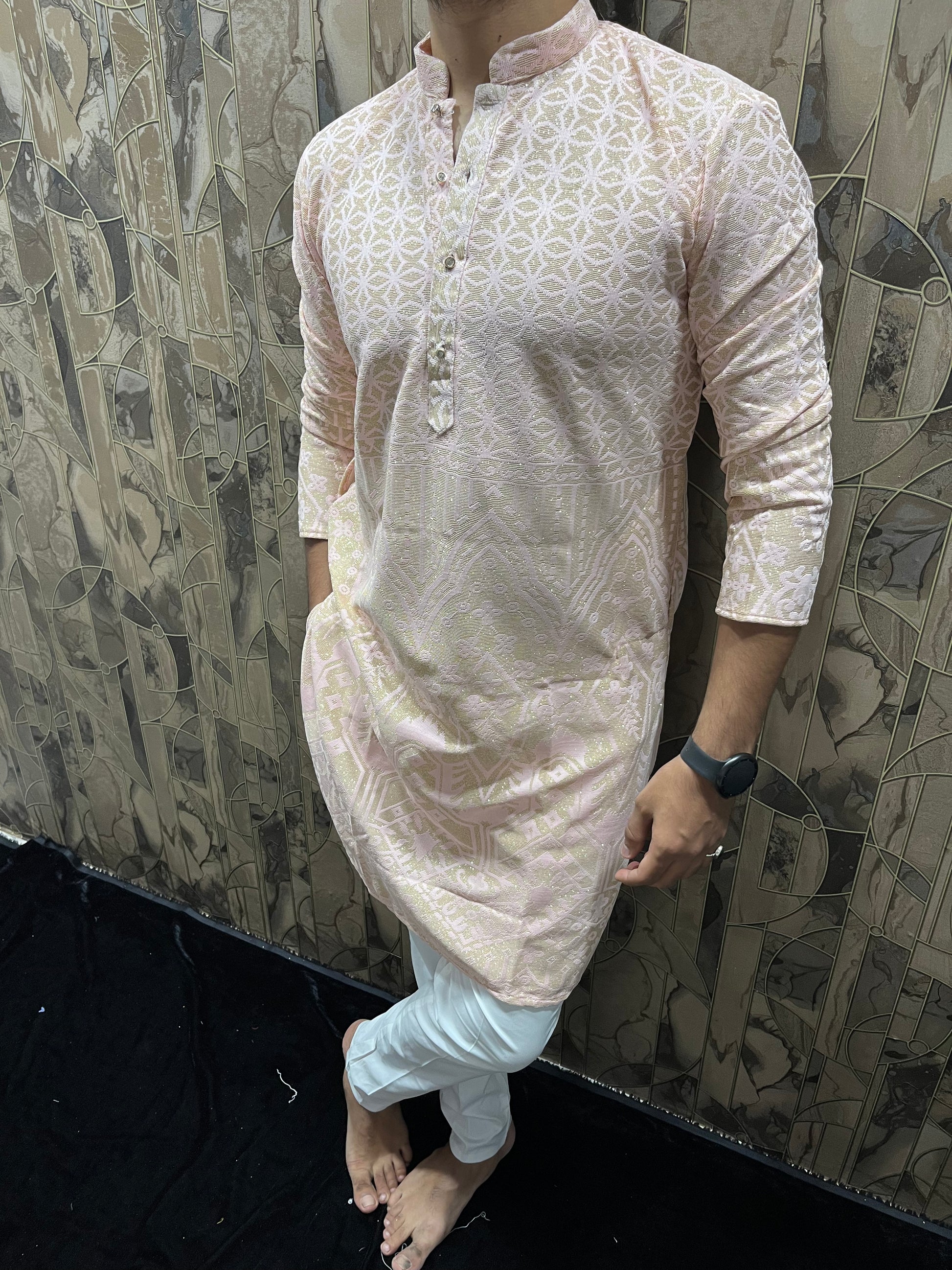 Men’s Light Pink Kurta – Full Front & Back Embroidery with Golden Zari & Daman Work A34