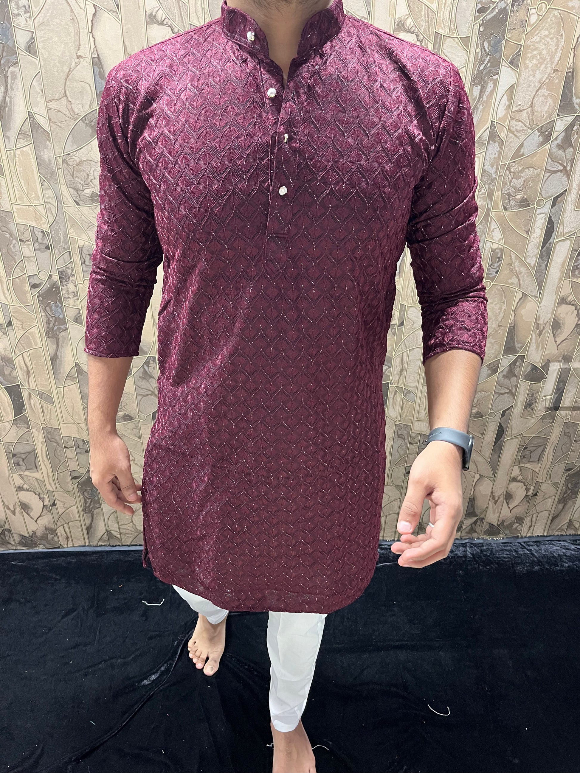 Men’s Maroon Kurta – Full Front & Back Embroidery with W-Pattern for Wedding & Festive Wear A37