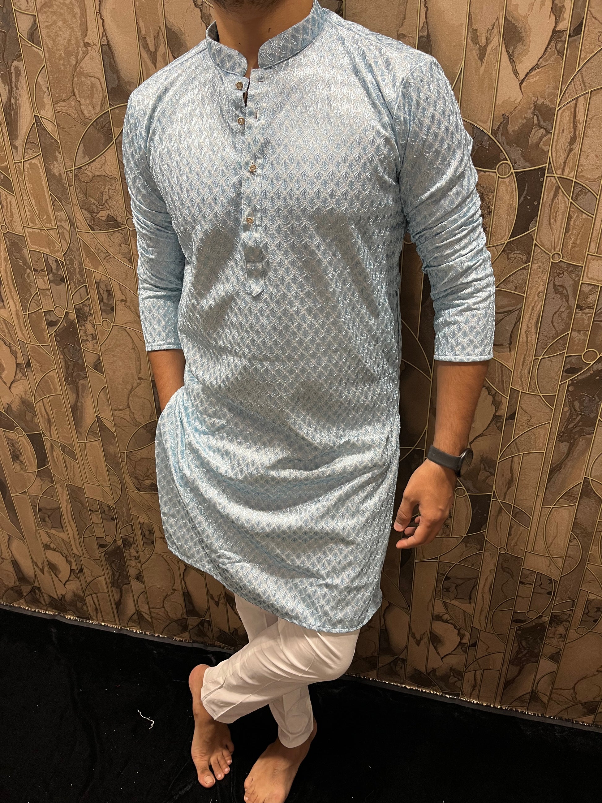 Men’s Sky Blue Kurta – Full Embroidery for Wedding & Festive Wear A35