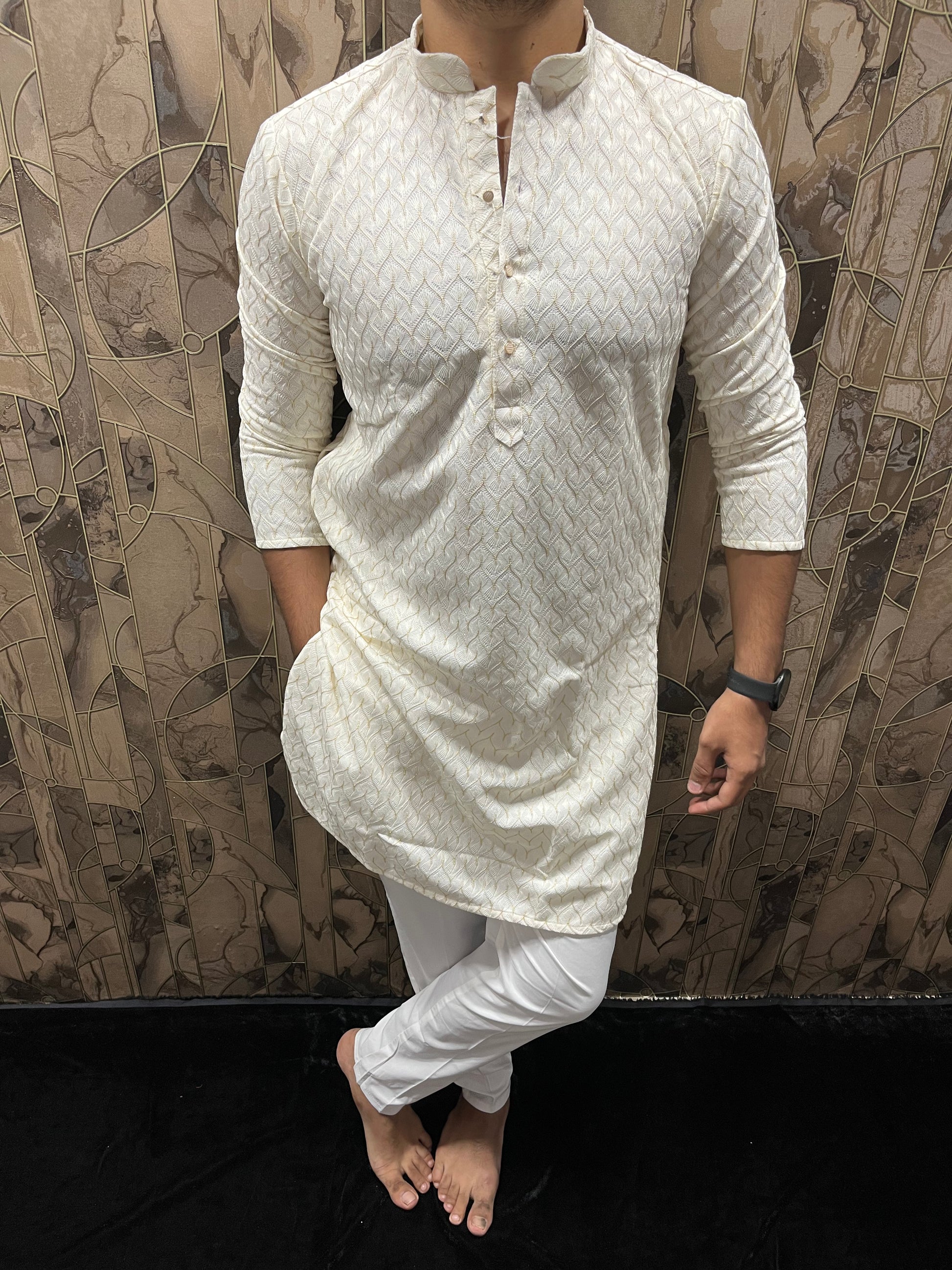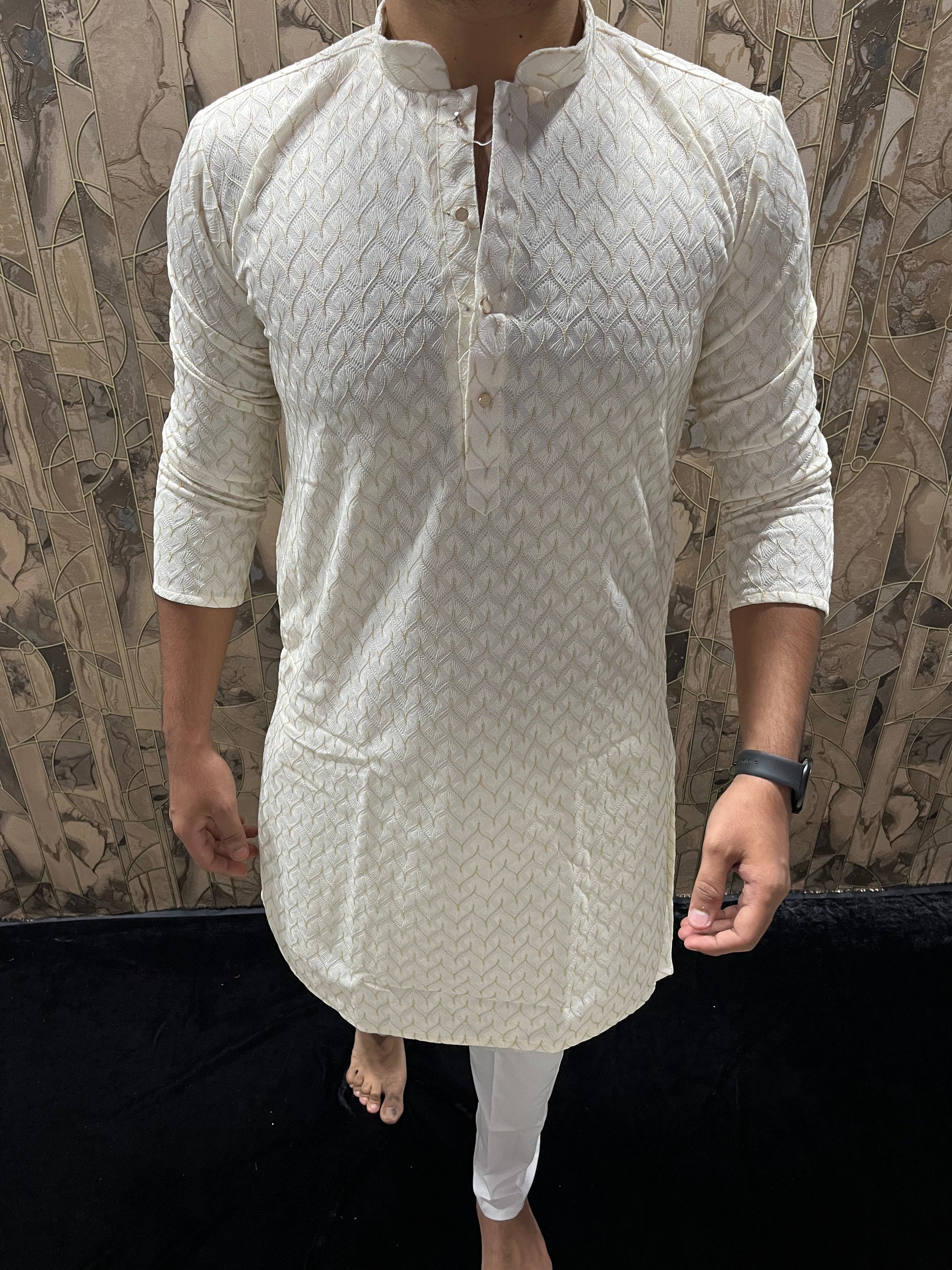 Men’s White Kurta – Full Front & Back Embroidery with W-Pattern for Wedding & Festive Wear A37